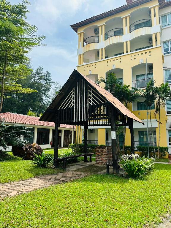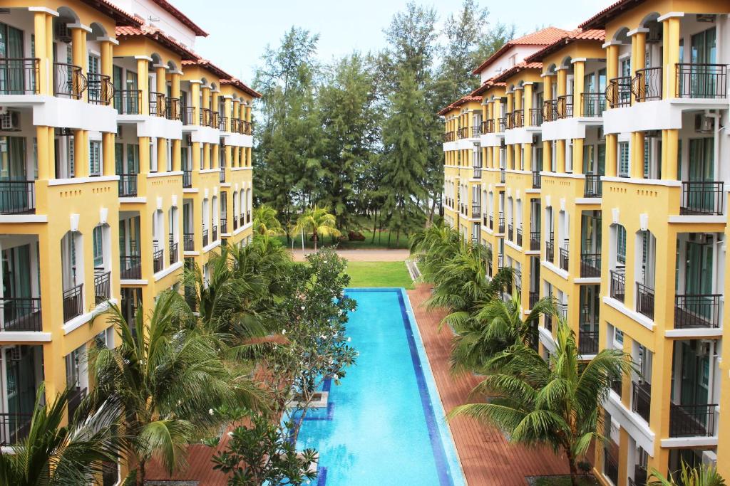 This place is not a resort.It is a basic condo which has two big swimming pools.During booking time facing is not known but units facing family pool are preferred.Although other units also clean and spacious and well connected to pool and beach.But there are units which may have beach viewing.Veach is a bit flat and calm with black sand.Also seems like local people during evening use this beach but it is indeed good as we can see some vibes like music and bbq..Tgey have small mart.Breakfast is the biggest disappointment..On first day we were asked to choose from very limited options..Although chef came in person to discuss veg options but only from the same selected menu ..90% items are frozen prepared..If you like Malay food then it’s okay..In portion you will get 60% spoon size items.